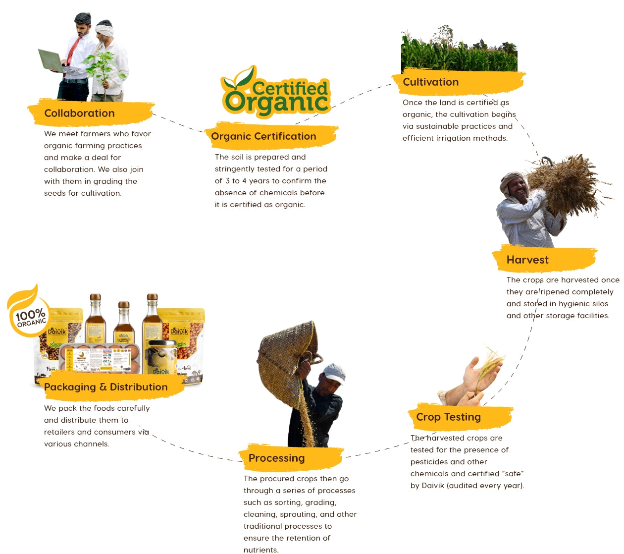 Every food product offered by Daivik is authentically cultivated, harvested, and directly procured from the certified organic farms, thus cutting down the middlemen. We also appreciate and promote sustainable agricultural practices, seeding, and food grading processes, and help farmer communities thrive by working with them closely and helping them get access to new technologies and techniques. By doing so, we not only contribute to social wellness but also stand by our Indian culture and uplift the domestic economy.